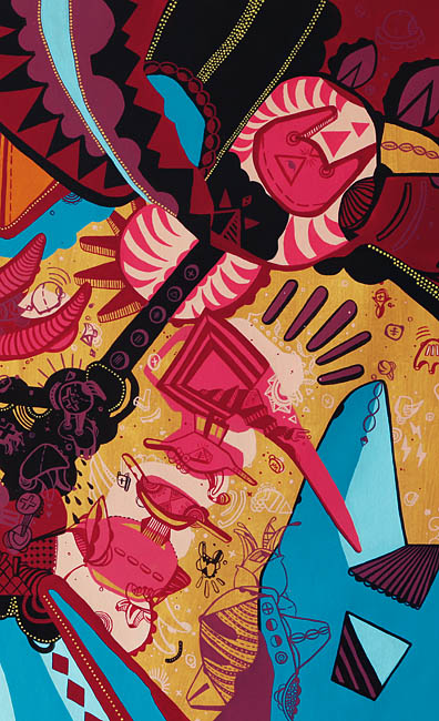 Afro-Brazilian religions and mythologies from the forest. Icons from Umbanda, Candomblé and Santo Daime coexist in a psychedelic profusion of colors. Diagonal lines confer a fast rhythm to this ecumenic visual percussion, and warm colors encircle shells, crosses from several traditions, crowns, animal skins, laces, eyes, drums, axes, pyramids, wings, suns, bead necklaces, flags, and swords.